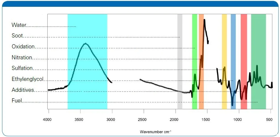 The carbonyl index, which is the ratio of the carbonyl peak area to a reference peak from the base oil, is calculated as the main oxidation indicator. Hydroxyl absorption in the 3200 to 3600 wavenumber region adds information about moisture. Drops in absorption at antioxidant wavelengths show how much of the protective additive has been used up. All of this comes out of one single FTIR scan.